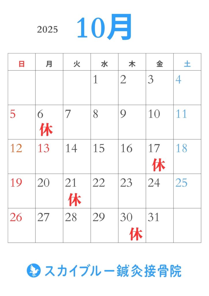 10月6日(月)、17日(金)、21日(火)、30日(木) 休み